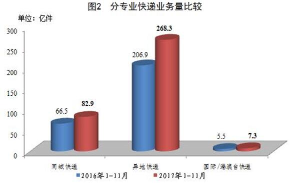 1-11月,同城、異地、國際/港澳臺快遞業(yè)務量分別占全部快遞業(yè)務量的23.1%、74.8%和2.1%;業(yè)務收入分別占全部快遞收入的14.7%、50.9%和10.6%。與去年同期相比,同城快遞業(yè)務量的比重下降0.7個百分點,異地快遞業(yè)務量的比重上升0.6個百分點,國際/港澳臺業(yè)務量的比重上升0.1個百分點。