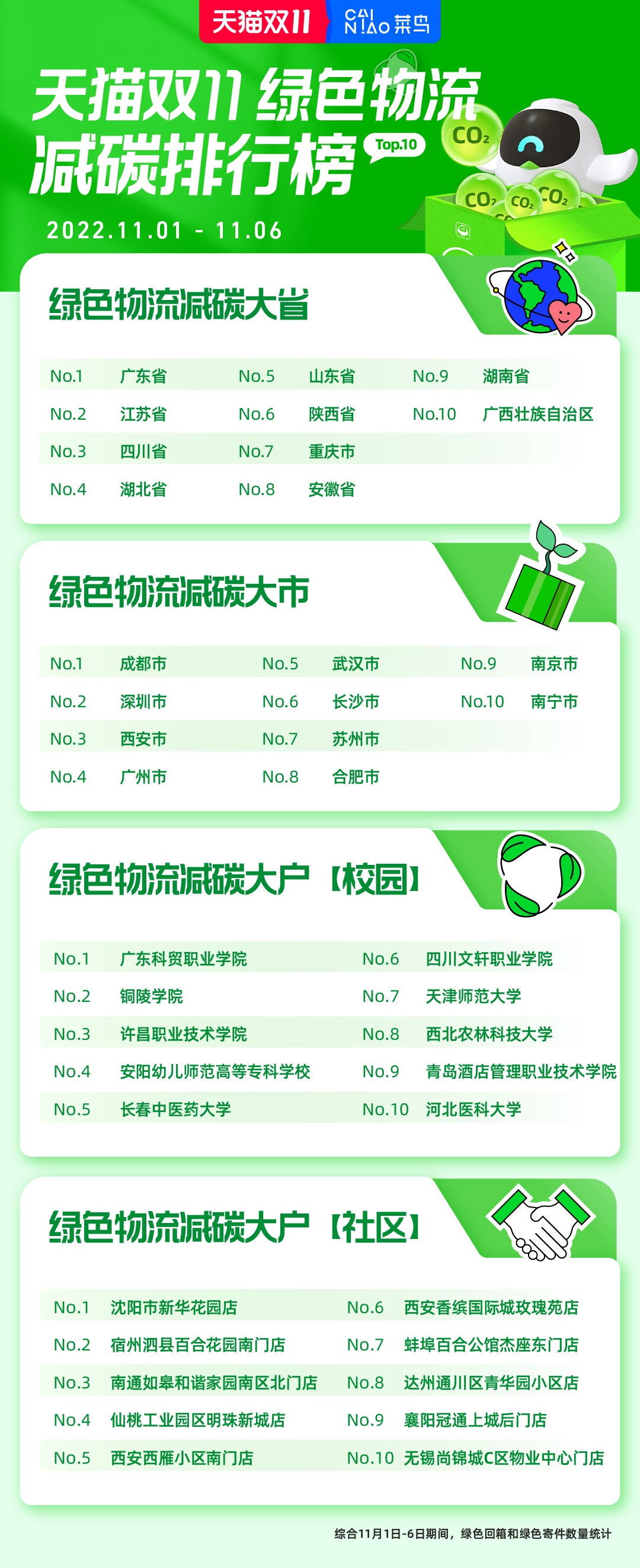 菜鳥公布天貓雙11減碳排行榜 廣東繼續(xù)領(lǐng)跑減碳大省排行榜