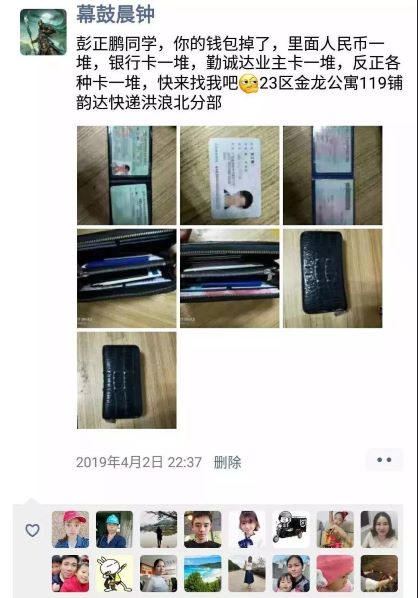 2019年04月30日來源:韻達速遞2019年4月2日,韻達深圳洪浪北分部網(wǎng)點負責人鐘開際在怡園路工作時,發(fā)現(xiàn)路上有個黑色錢包無人認領(lǐng),便撿起來清點了里面的物品(內(nèi)有七八張銀行卡、現(xiàn)金及身份證駕駛本等重要證件)。